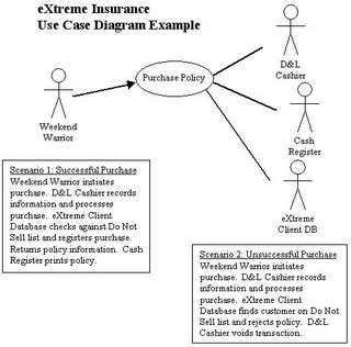 В качестве примера можно взять страховую компанию. Компания создает новую систему для поддержки продаж страховых полисов экстремальным спортсменам. Данные полисы продаются кассирами в спортивных магазинах. На диаграмме отображен прецедент продаж полисов. К данному сценарию можно добавить регулировку транзакций и обработку заявок.